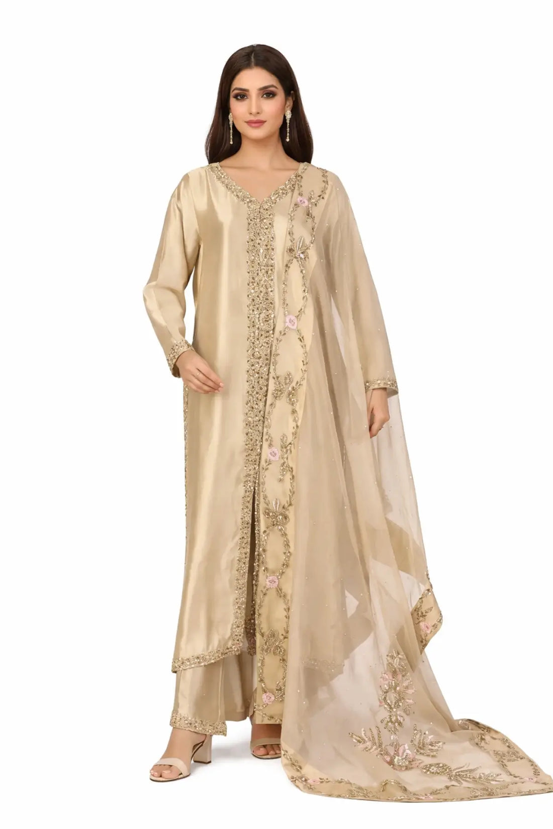 Kavia – Luxury Gold Designer Outfit for Pakistani Women Abroad