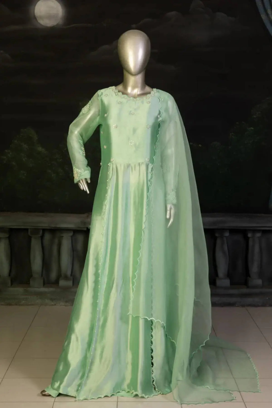 Description: Step into elegance with this mint green Sheesha silk Anarkali, featuring a flowy, floor-length...