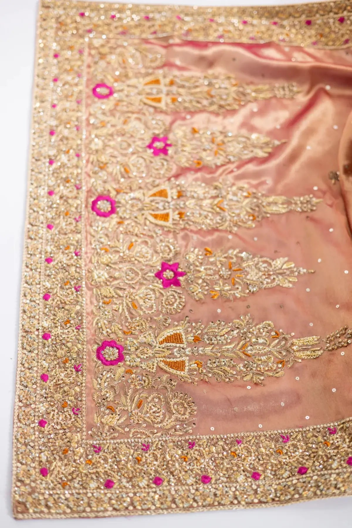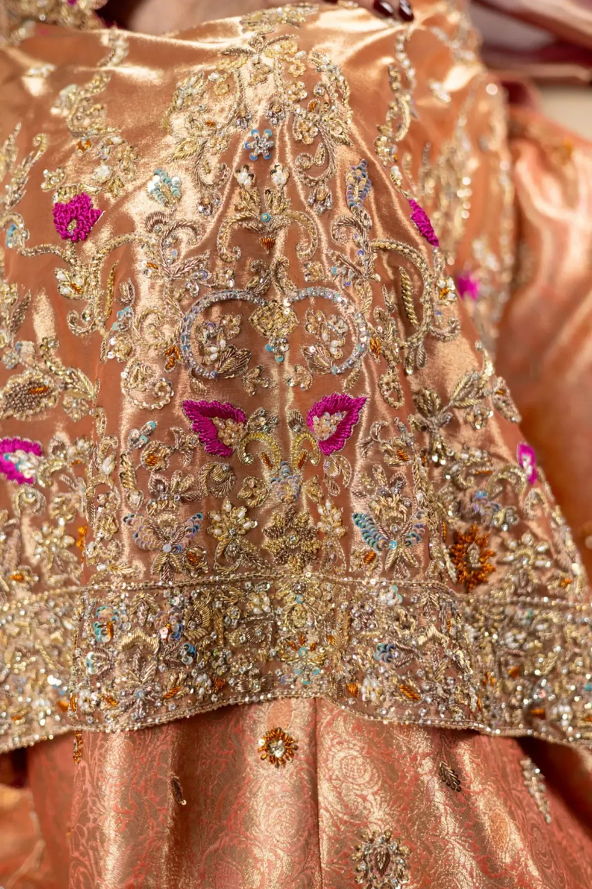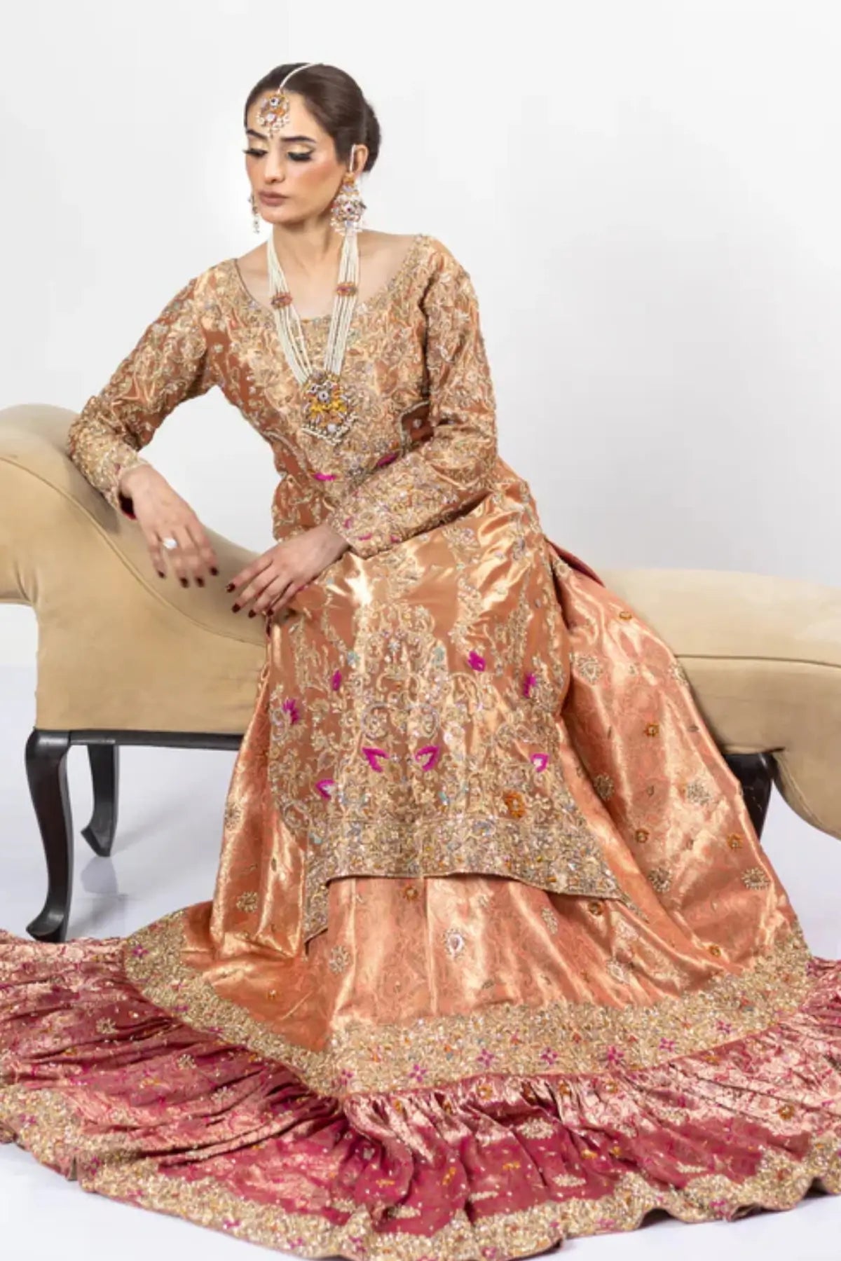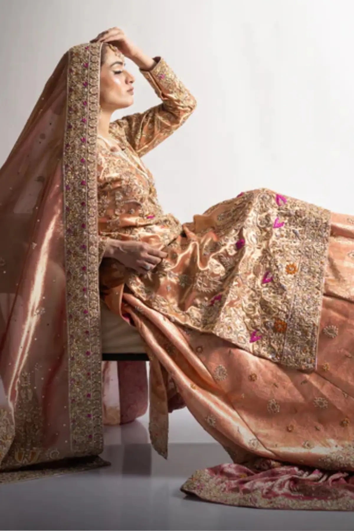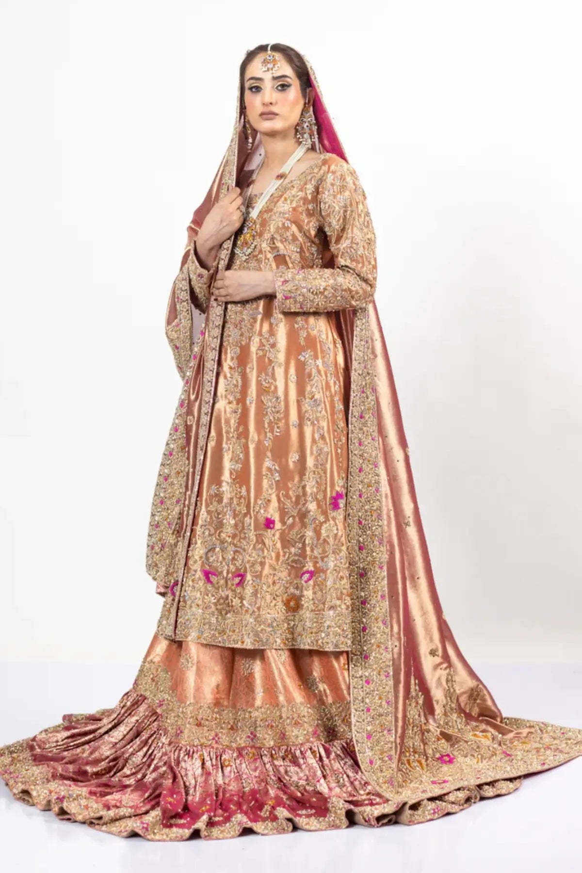 Step into bridal elegance with Afsheen by MariamRaj, a luxurious long tissue silk Pishwas paired with a pure Jamawar Gharara and a delicate tissue dupatta. Expertly handcrafted, this bridal outfit is adorned with intricate zardoze and resham embroidery, highlighting traditional craftsmanship with modern appeal. Available in peach gold and magenta pink, it’s perfect for Nikah, Mehndi, and wedding receptions. Customized stitching ensures a flawless fit for US, UK, Canada, and worldwide brides seeking timeless style and sophistication.