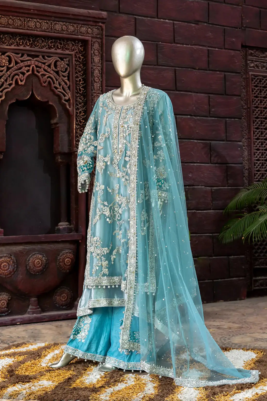 Avelin by MariamRaj is a regal teal Pakistani formal suit, crafted for women in Canada who seek statement elegance with rich heritage detailing. This exquisite three-piece formal outfit features a net shirt layered over a tissue silk inner, lavishly hand-embellished with silver zari, dabka, naqshi, sequins, pearls, cutdana, and mirror work.