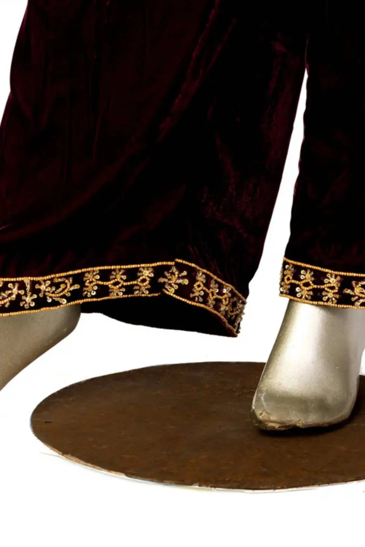 This stunning ensemble features a rich purple velvet fabric shirt with intricate embroidery along the neck. The shirt’s unique design is complemented by frock-style sleeves, adding elegance and flair. The matching culottes are beautifully detailed with embroidered borders, offering a modern twist on classic sophistication. To complete the look, the outfit is paired with an elegant organza dupatta, adding a soft, ethereal touch. This set is perfect for weddings, festive occasions, or formal gatherings, offering a blend of tradition and contemporary style.