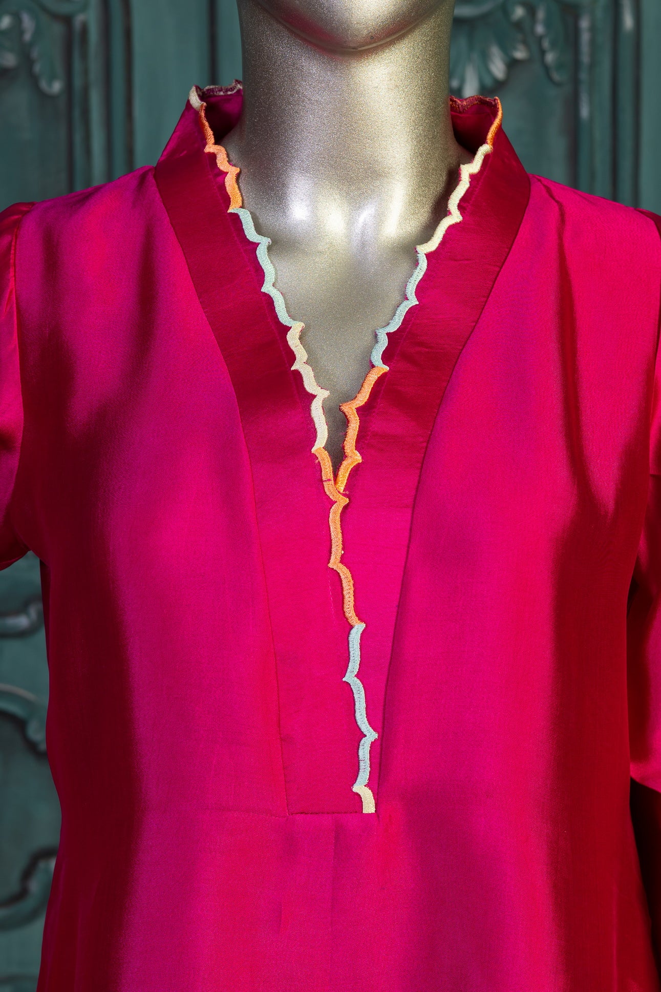Introducing our exquisite magenta pink silk ensemble, a harmonious blend of traditional craftsmanship and contemporary elegance. The luxurious silk kameez showcases intricate multi-color thread embroidery on the sleeves, adding a vibrant touch to the rich magenta hue. Paired with a gracefully flowing farshi shalwar, this outfit embodies regal sophistication, perfect for weddings, festive occasions, or any celebration where you wish to exude grace and style. Complete the look with traditional jewelry and embellished footwear to enhance its beauty. Perfect for: Eid, Festive Gatherings, Formal Events.