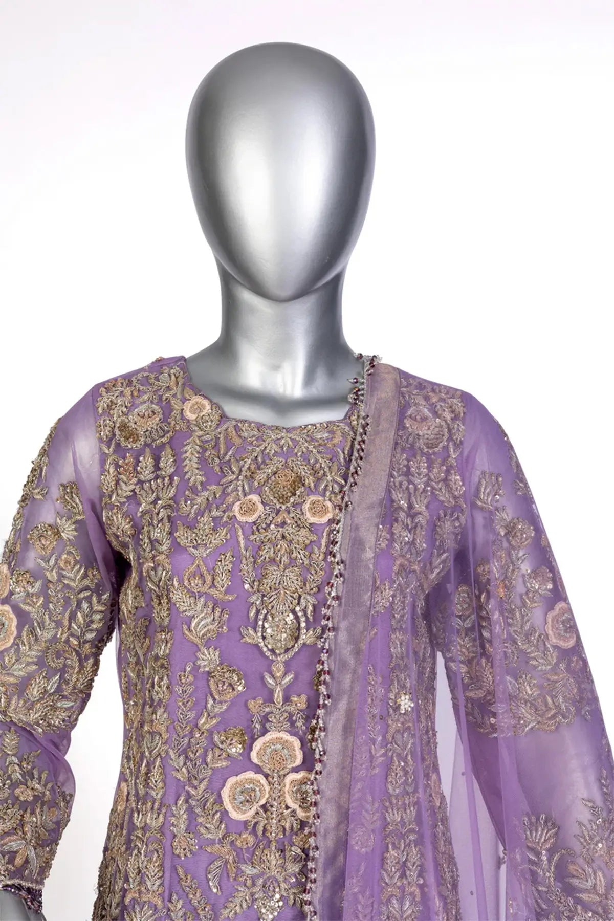 Elevate your wedding style with Isleen by MariamRaj, a formal lilac ensemble perfect for mehndi, nikkah, and reception events. The net shirt is adorned with exquisite baby pink resham floral embroidery on the neck and sleeves, paired with a tissue straight bottom and a flowing tissue dupatta. This outfit blends traditional charm with modern elegance, designed for brides and guests in the US, UK, Canada, and worldwide.