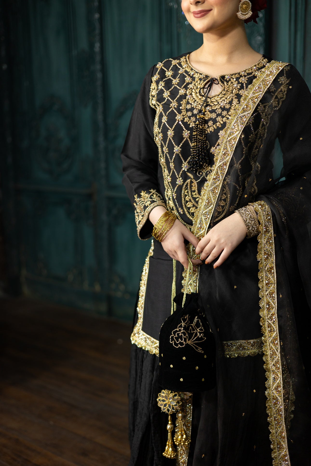Make a statement with this stunning black and gold sharara suit, perfect for weddings, festive occasions, and special celebrations. The outfit features a beautifully embroidered black kameez adorned with intricate gold detailing, exuding regal charm and sophistication. The flowy sharara pants, designed with a crinkled texture, add a touch of elegance, while the matching black dupatta with gold embroidery completes the look with finesse.