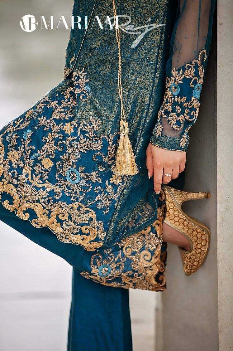 Magnificent teal is a net angrakha with pure jamawar inner adorned with hand embellishments. Paired with hand embellished bell-pants. Comes with a complimentary net duppatta. Perfect for Pakistani Ladies living in USA, UK, Europe and Canada
