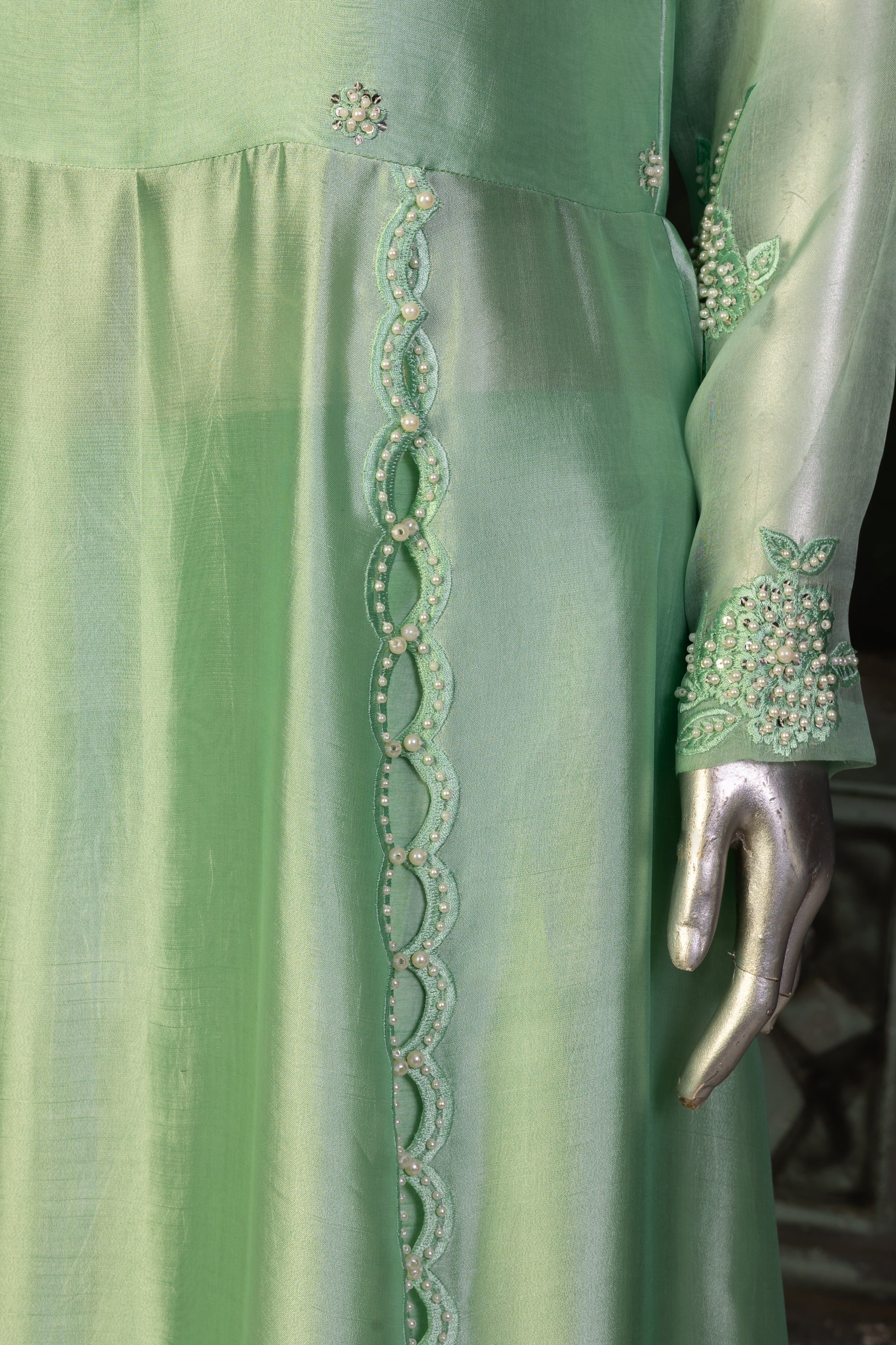 Step into elegance with this mint green Sheesha silk Anarkali, featuring a flowy, floor-length silhouette that exudes grace and sophistication. The delicately embellished bodice adds a touch of luxury, while the full sleeves and scalloped detailing enhance its charm. Paired with straight pants for a modern touch, this ensemble is completed with a sheer organza dupatta, giving it a dreamy, ethereal appeal. Perfect for weddings, festive occasions, and evening soirees, this pastel-hued beauty blends tradition with contemporary aesthetics.