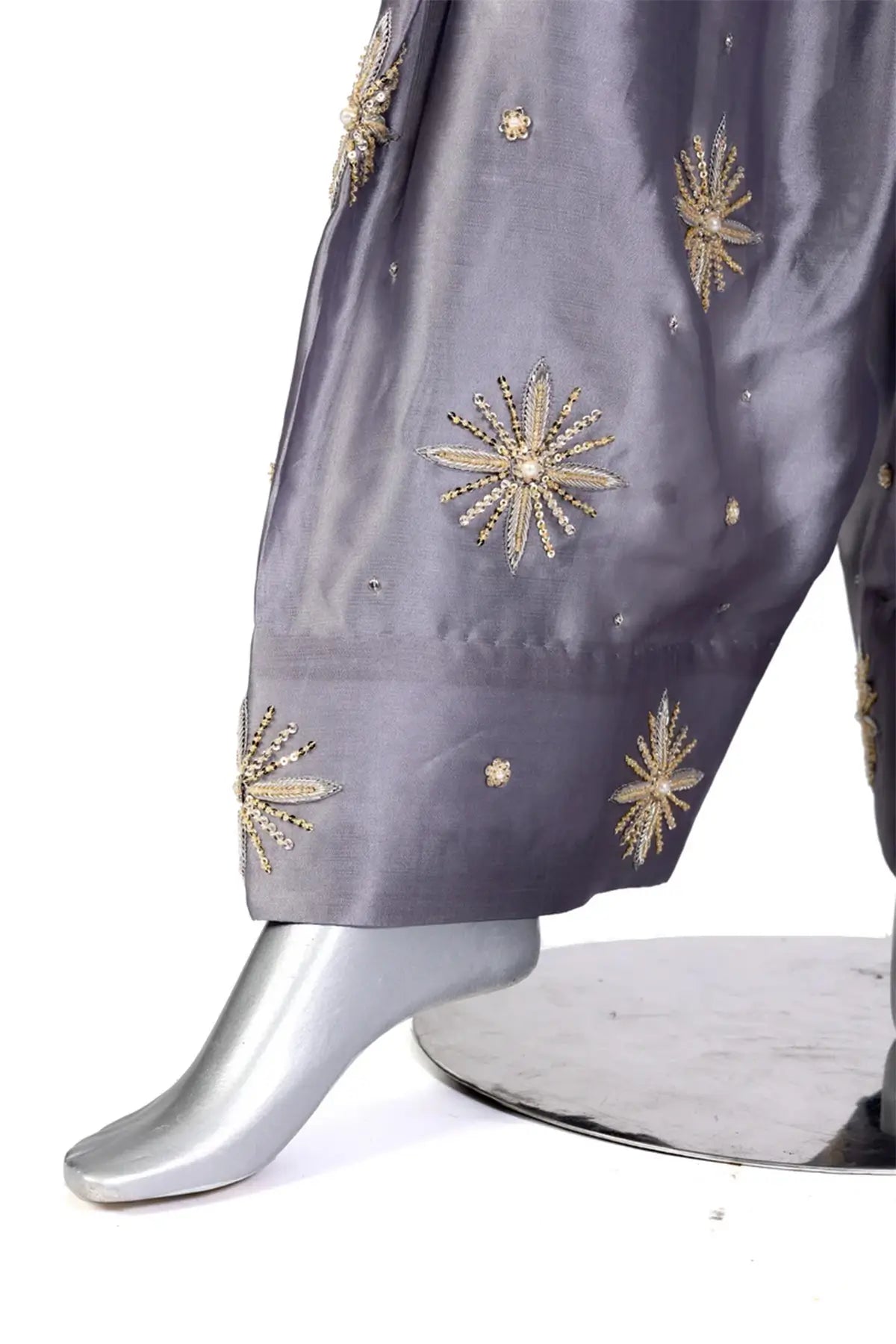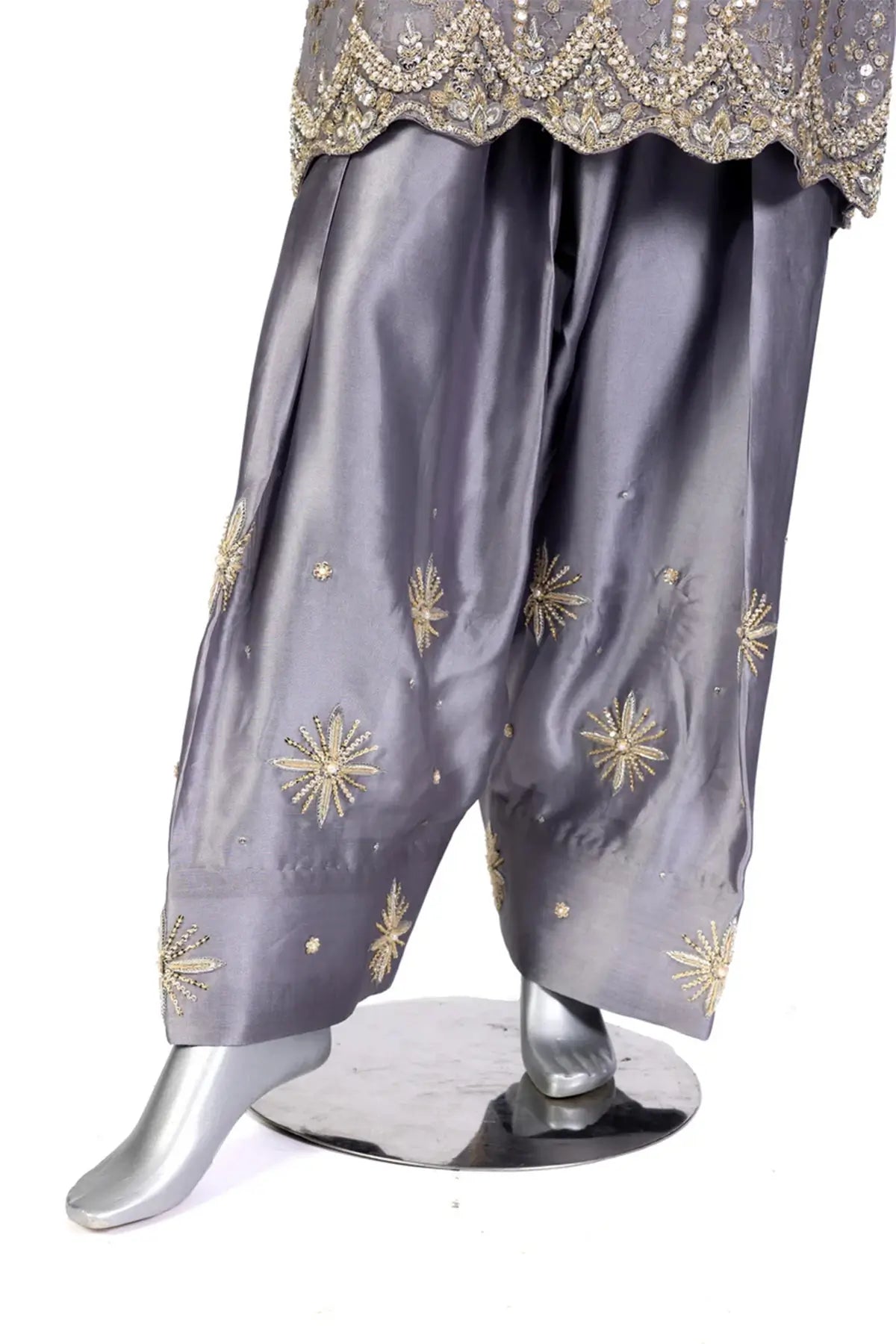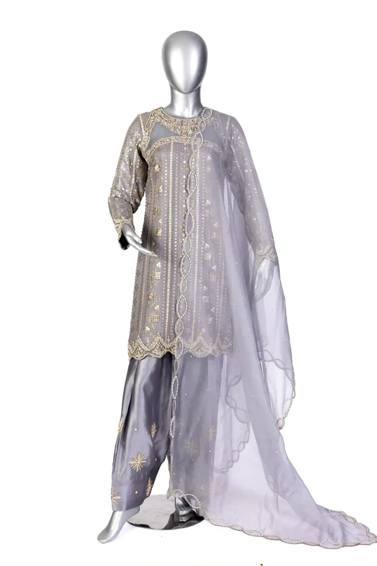 Step into sophistication with the Nayla Designer Party Wear Dress by MariamRaj. Featuring a grey chiffon shirt with intricate handwork embroidery, a luxurious sheesha silk shalwar, and a flowing organza dupatta with delicate borders, this ensemble perfectly balances traditional elegance and modern style. Ideal for weddings, dinner parties, evening events, and festive gatherings, Nayla ensures you make a statement with every step.