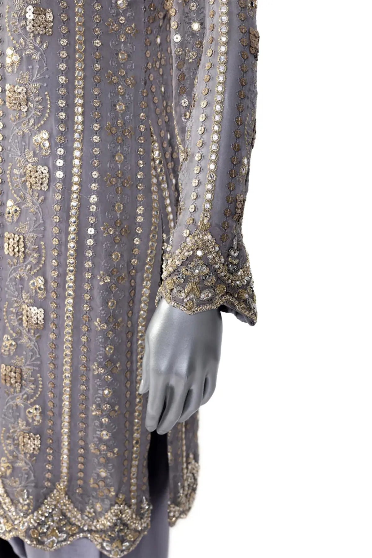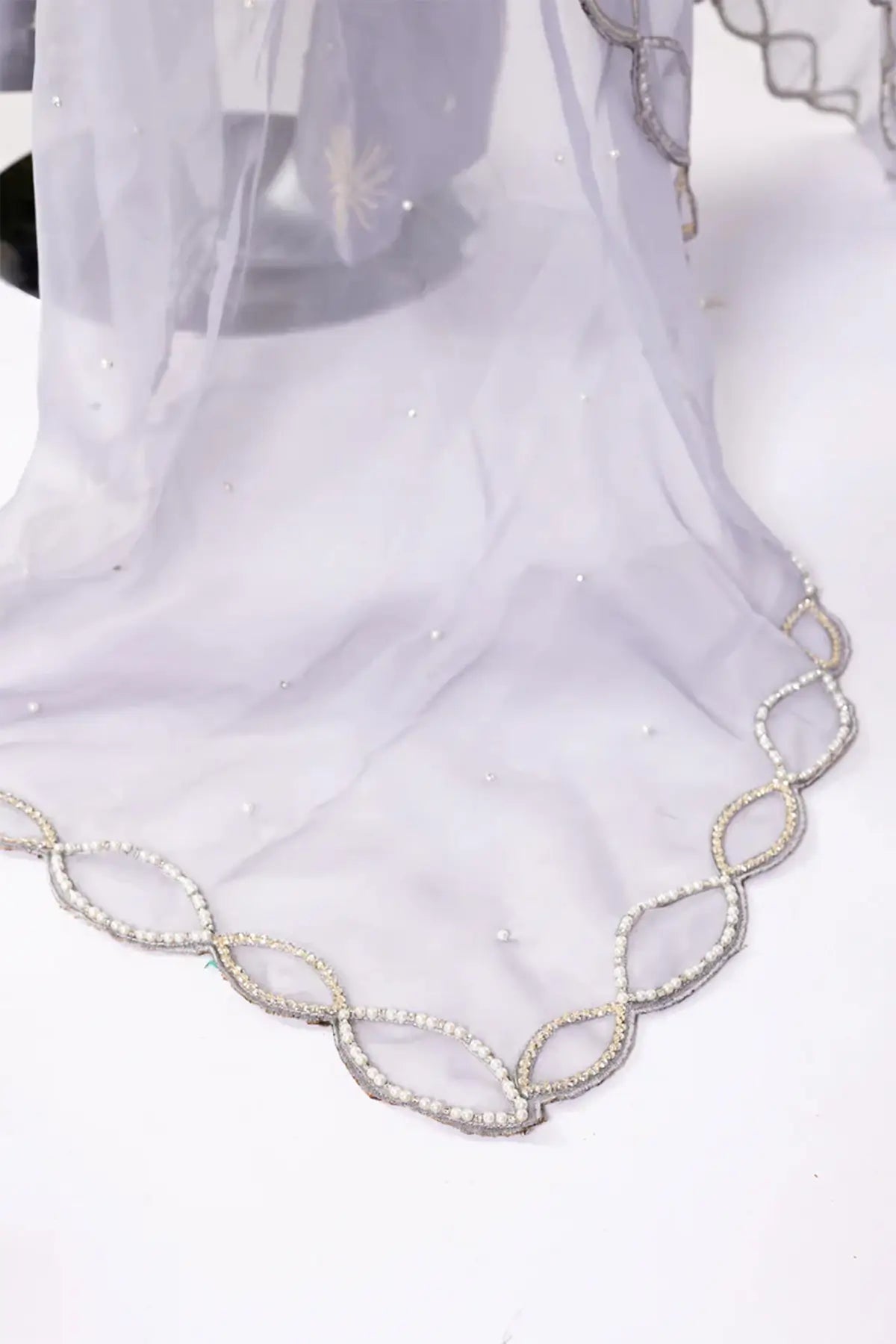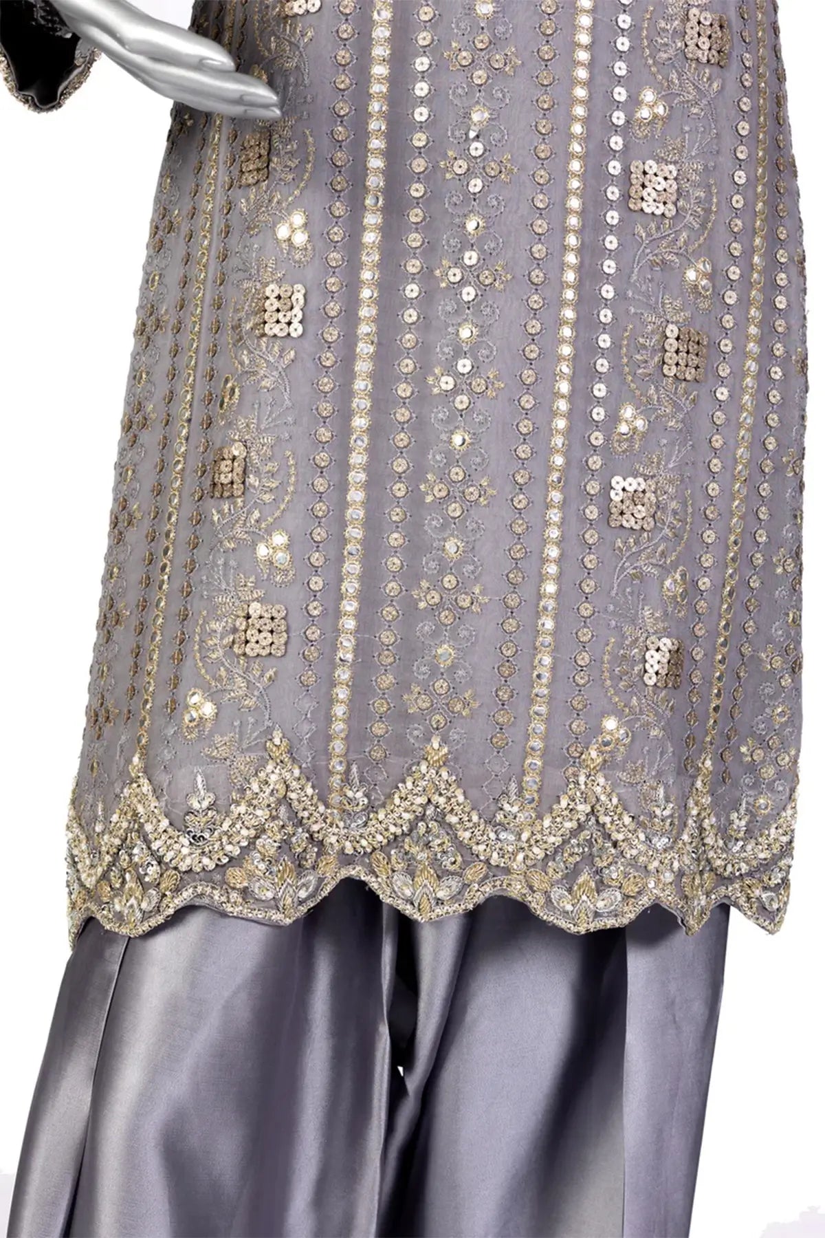 Step into sophistication with the Nayla Designer Party Wear Dress by MariamRaj. Featuring a grey chiffon shirt with intricate handwork embroidery, a luxurious sheesha silk shalwar, and a flowing organza dupatta with delicate borders, this ensemble perfectly balances traditional elegance and modern style. Ideal for weddings, dinner parties, evening events, and festive gatherings, Nayla ensures you make a statement with every step.