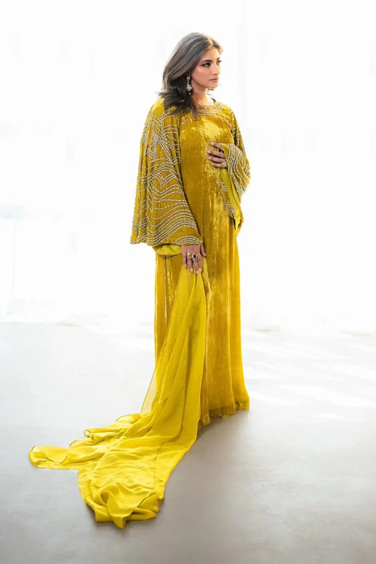 Turn heads in Nooraya, a vibrant lime green kaftan crafted from pure French velvet. Featuring elegant bell sleeves with delicate embellishments, it’s paired with Korean pants for a modern silhouette and a flowing pure silk dupatta to complete the look. Perfect for Eid, mehndi nights, or any festive celebration.