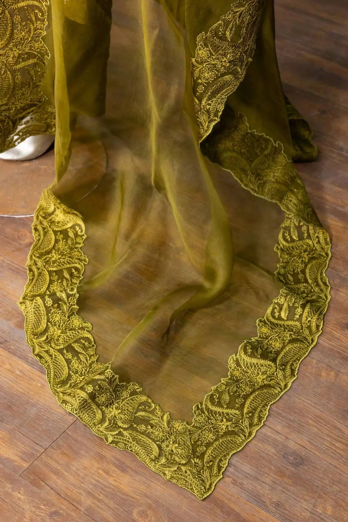 Elevate your festive and formal wardrobe with this exquisite olive green sheesha silk outfit. Designed for elegance, the outfit features a beautifully embroidered sheesha silk shirt paired with straight capri pants for a sleek silhouette. The luxurious organza dupatta, adorned with intricate golden embroidery, adds a regal charm to the look. Perfect for weddings, Eid, and special celebrations, this ensemble blends tradition with modern sophistication. Shop now for a timeless fashion statement.