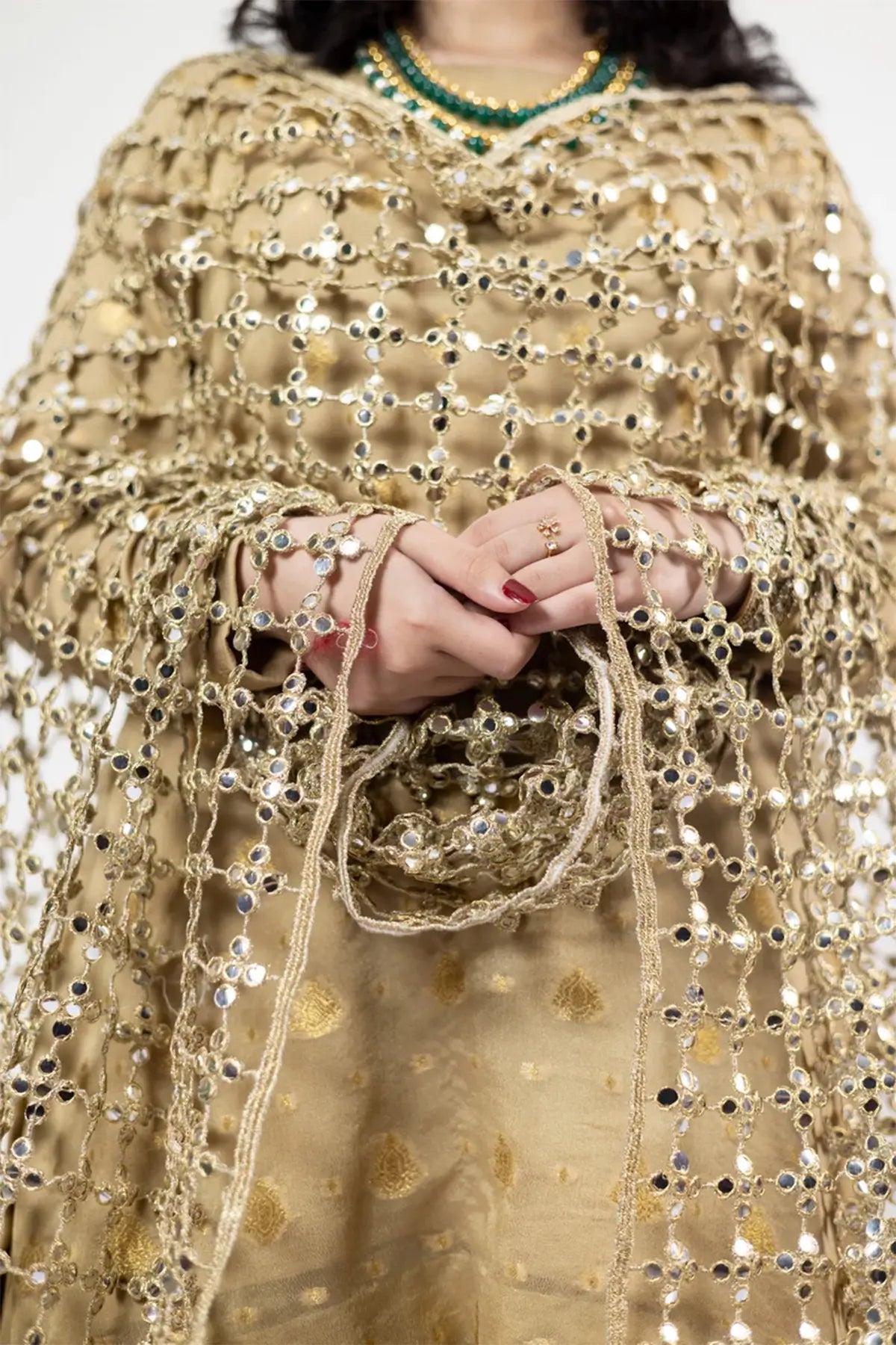 Posheeda Sheesh Duppatta – Gold Designer Frock & Gharara Set for Weddings