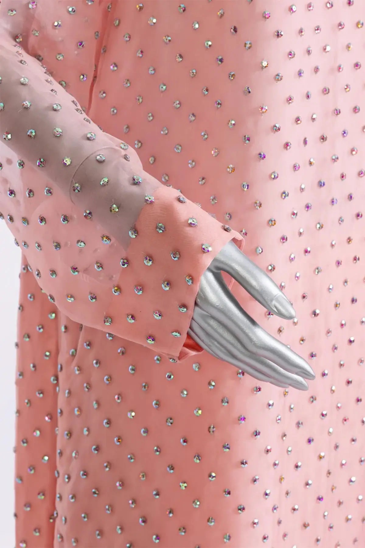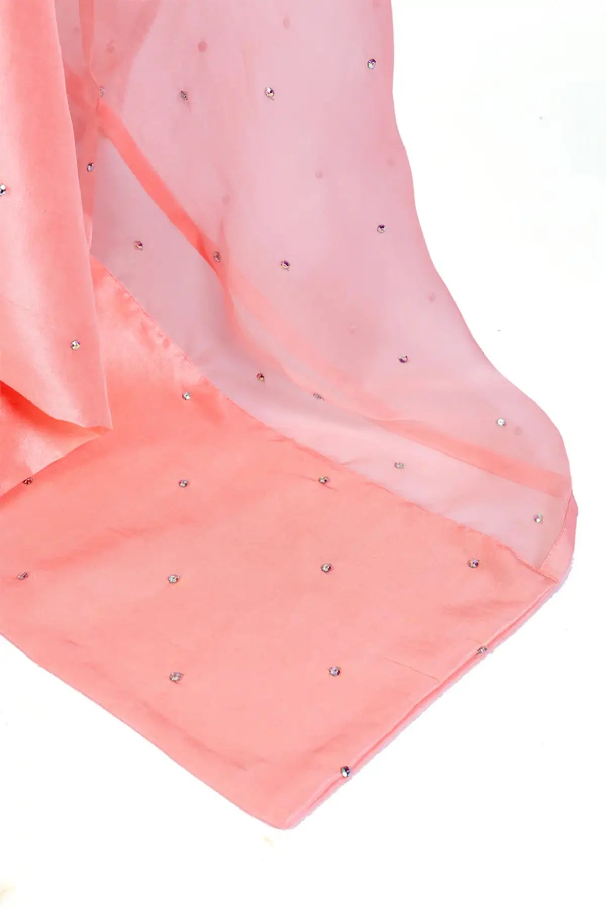 Exude timeless elegance with Roshanara by MariamRaj, a peach stitched Pakistani wedding formal suit crafted in premium fabrics. The pure organza shirt and dupatta, hand-embellished with intricate detailing, are paired with luxurious raw silk pants, creating a graceful 3-piece ensemble.