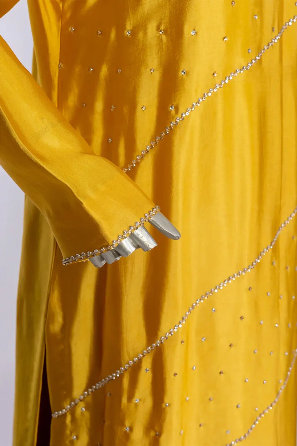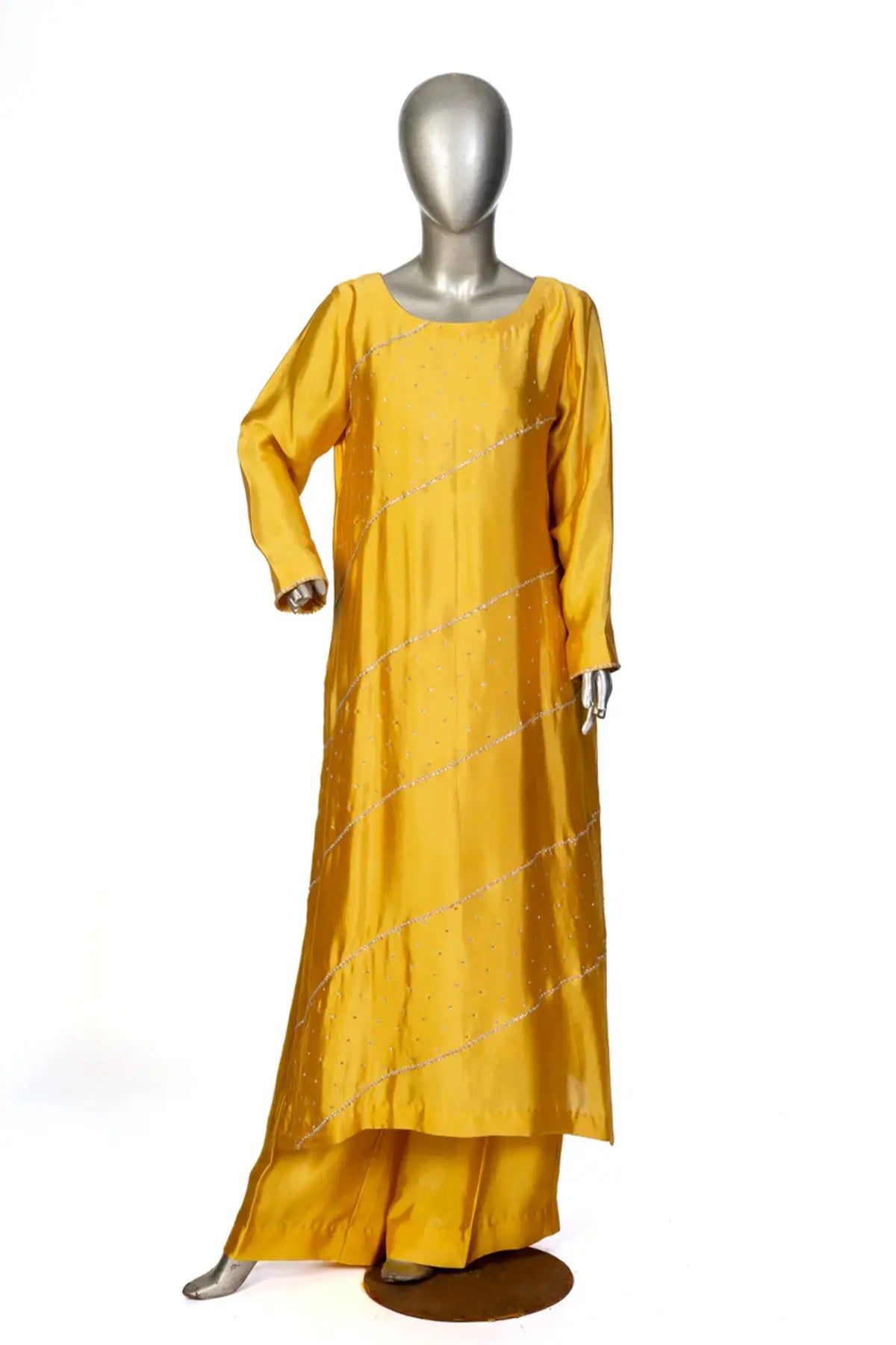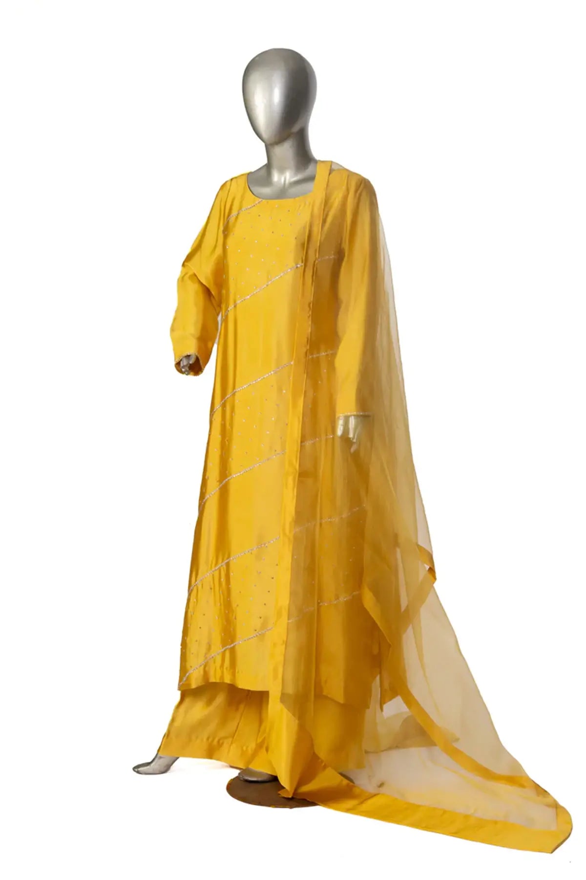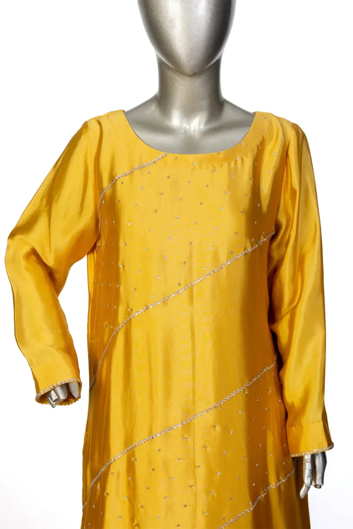 Safina by MariamRaj is a radiant mustard yellow sheesha silk outfit designed for festive and wedding events. The shirt is adorned with delicate stone and sequin handwork, creating a refined, luxurious look. Paired with matching silk trousers and a soft organza dupatta, this 3-piece ensemble blends modern elegance with timeless sophistication. Perfect for Eid, weddings, and formal gatherings, Safina embodies premium craftsmanship and chic design. Shop this stitched silk outfit online at MariamRaj, with worldwide shipping to USA, UK, Canada, and the UAE.