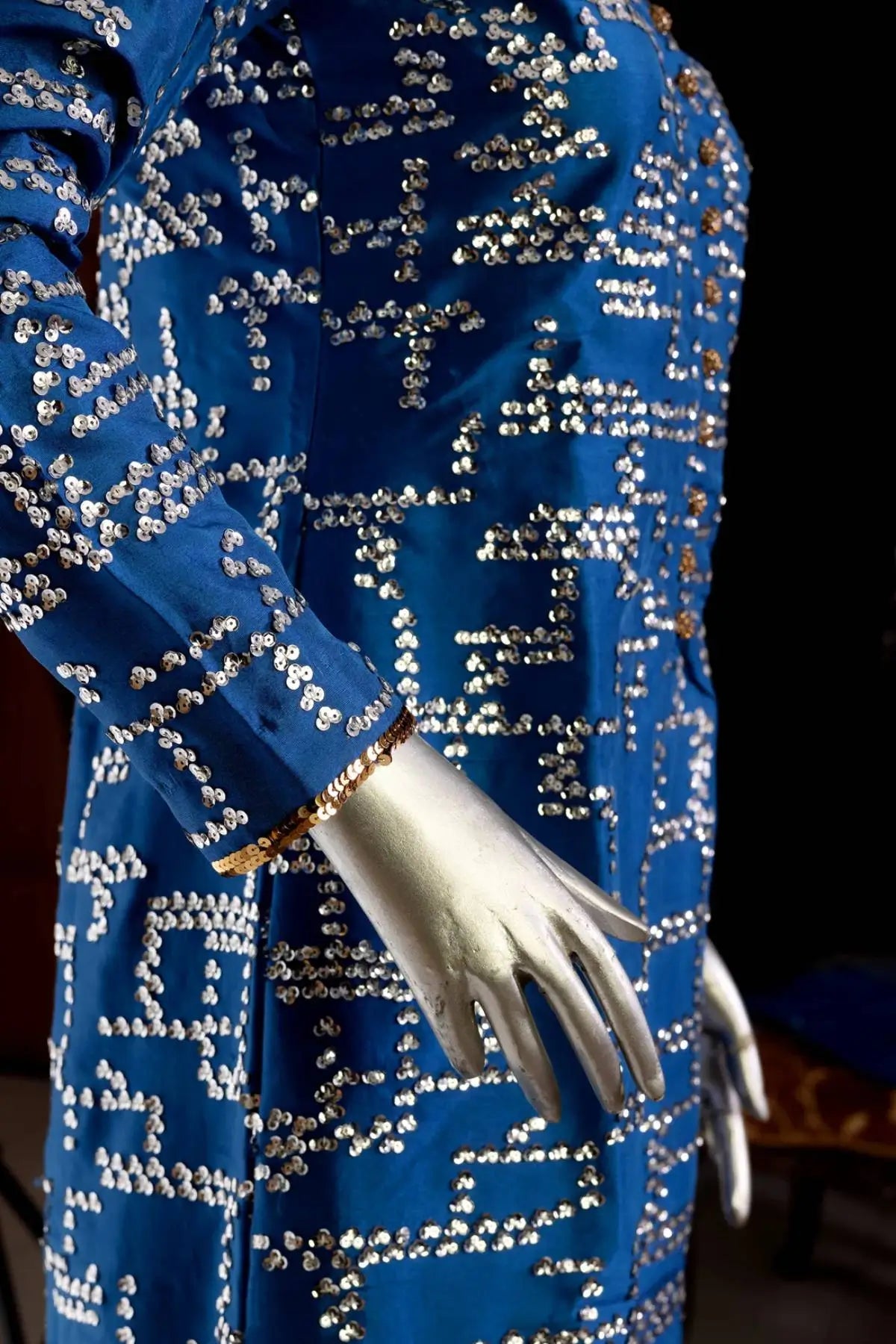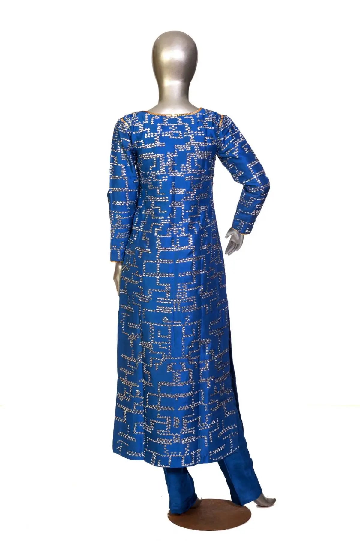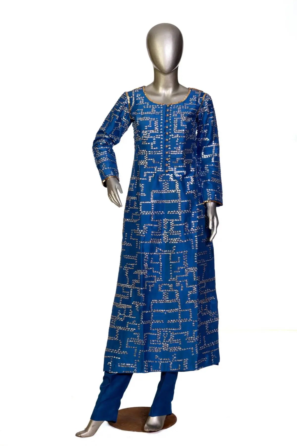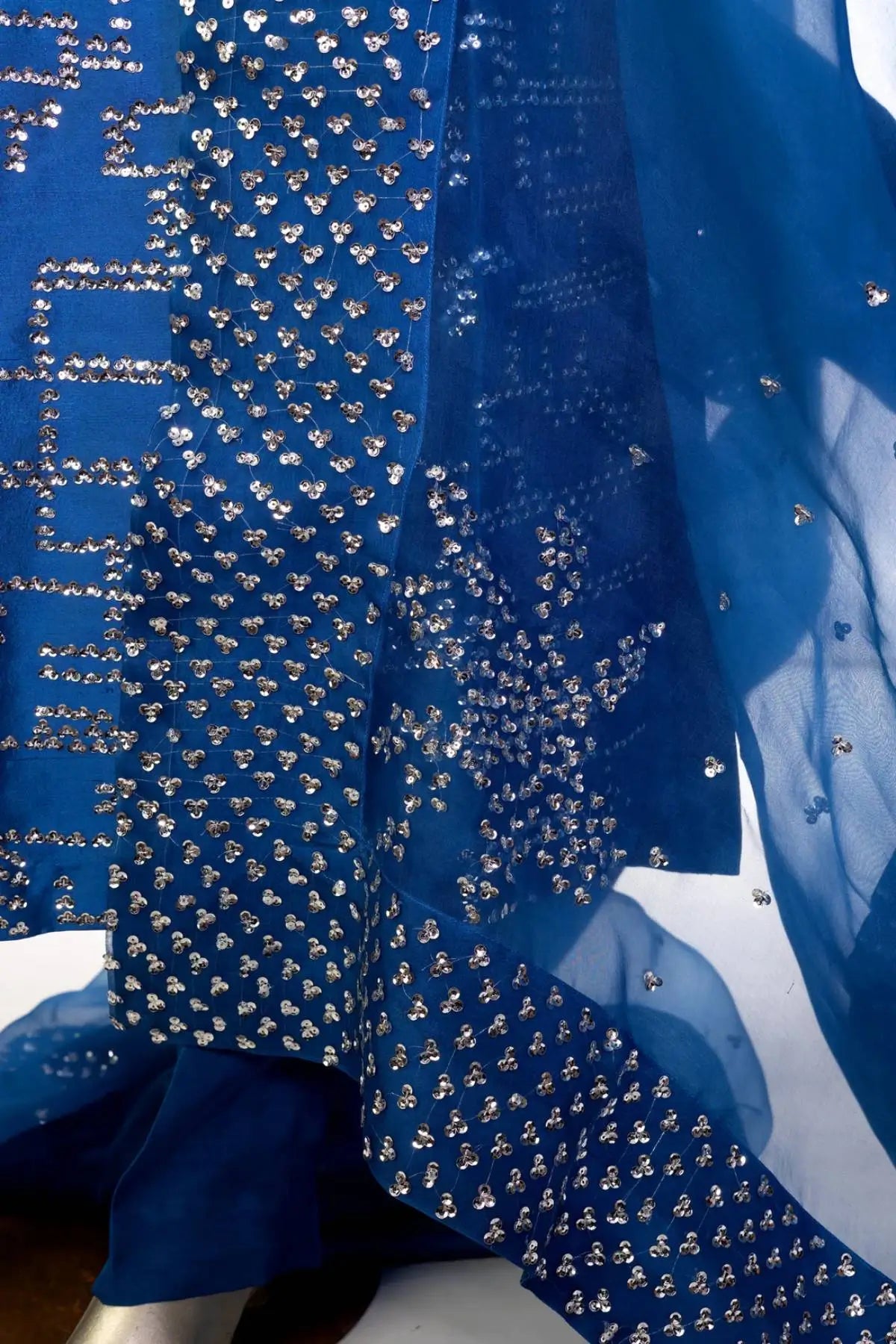 Stunning blue raw silk long shirt, fully adorned with intricate sequence work and embellishments, paired with capri pants. The look is completed with a long organza dupatta featuring delicate sequence embellishments for a refined, festive appeal.