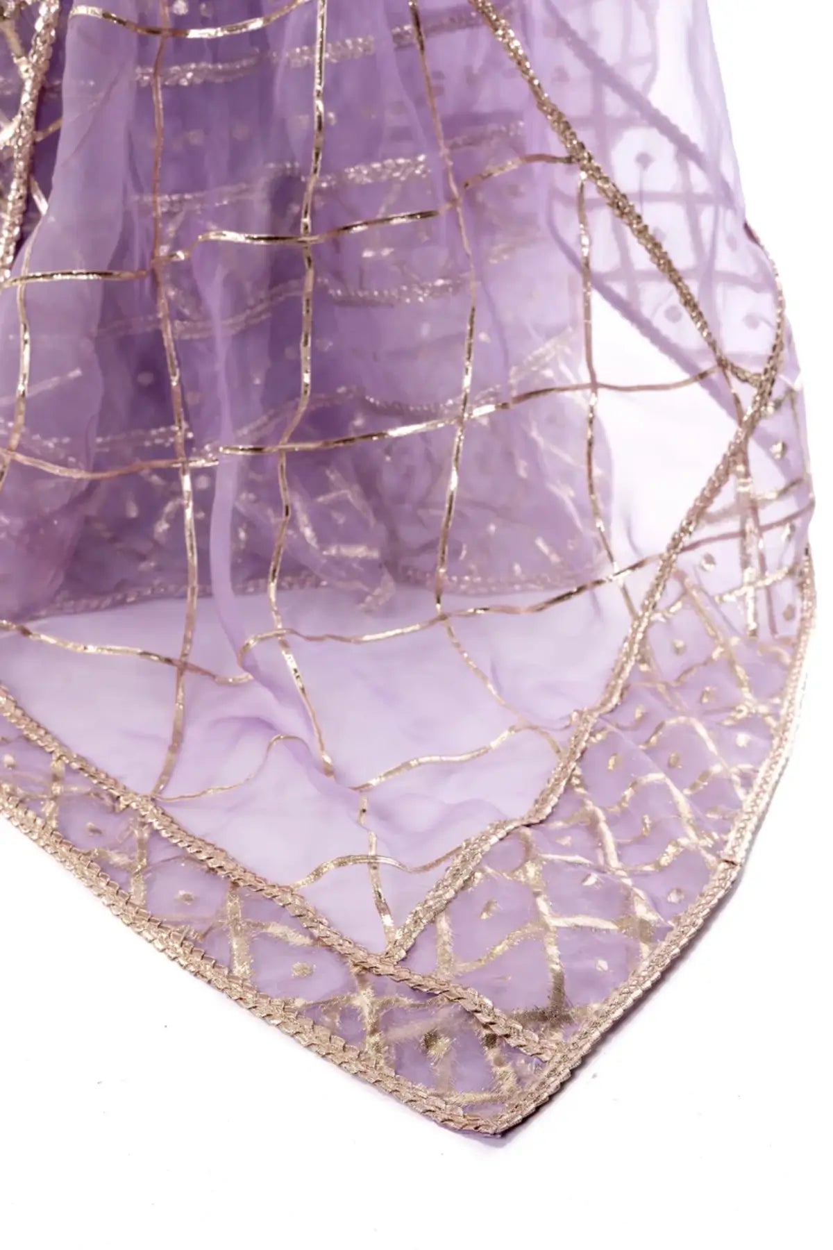 Sehrish – Lavender Wedding Formal Suit by MariamRaj, available at MariamRaj.com, is crafted for women who adore luxury couture. Designed in pure raw silk, the lavender shirt features gota embellishments and delicate embroidery, paired with a voluminous buti organza gharara finished with intricate golden gota lacework. The ensemble is elevated with a matching lavender organza dupatta, adorned with gota borders and motifs for a royal finish. Perfect for weddings, festive events, bridesmaids, and formal parties, Sehrish is a stitched 3-piece designer outfit that blends traditional craftsmanship with modern elegance.