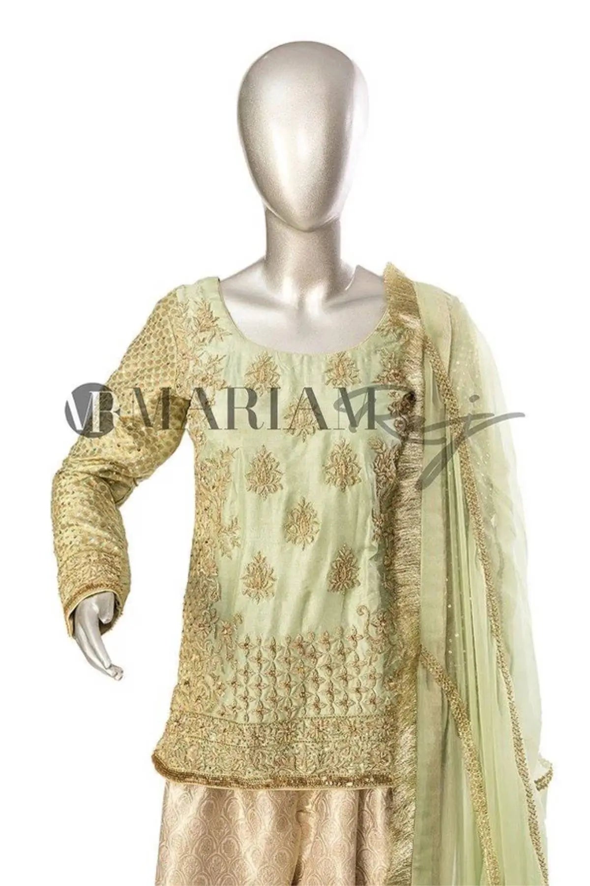 Elevate your festive wardrobe with this exquisite pistachio green gharara set. The ensemble features a delicately embroidered short kameez adorned with intricate golden embellishments, creating a stunning balance of elegance and tradition. The accompanying flared golden gharara, crafted from rich brocade fabric, adds a touch of regal charm with its textured shimmer. Completing the outfit is a sheer pistachio green dupatta, detailed with ornate golden lace on the borders for a sophisticated finish. Ideal for weddings, Eid, or formal occasions, this outfit perfectly captures grace and timeless beauty.