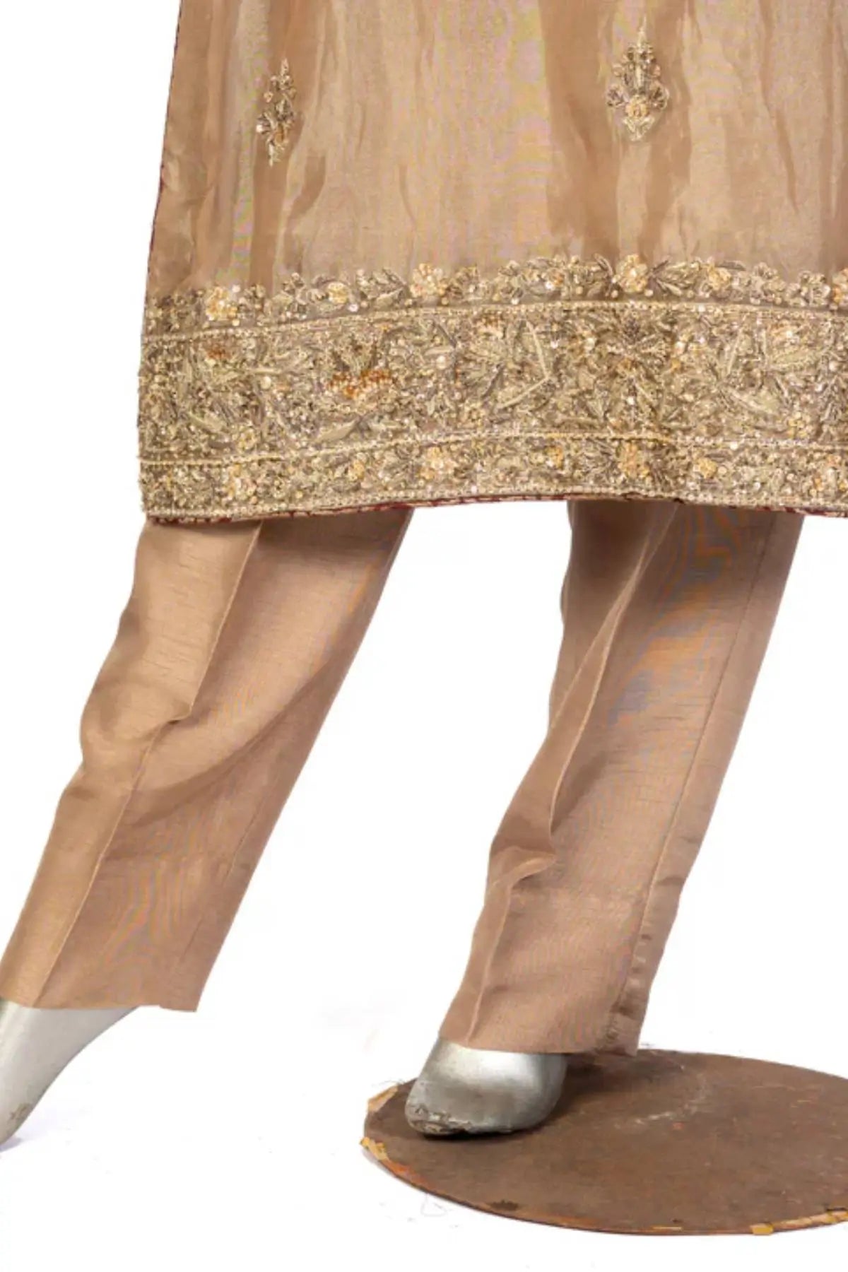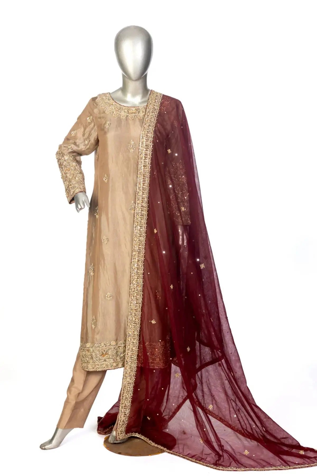 Shehnaz by MariamRaj is a luxurious wedding formal outfit designed in UAE-inspired gold and maroon hues. This 3-piece ensemble features a pure gold tissue shirt with intricate hand embroidery, matching tissue trousers, and a deep maroon net dupatta embellished with delicate handwork and borders. Perfect for wedding receptions, festive occasions, and formal events, Shehnaz blends traditional artistry with modern luxury. Shop this premium Pakistani wedding formal dress online at MariamRaj, with worldwide shipping to USA, UK, Canada, and the UAE.