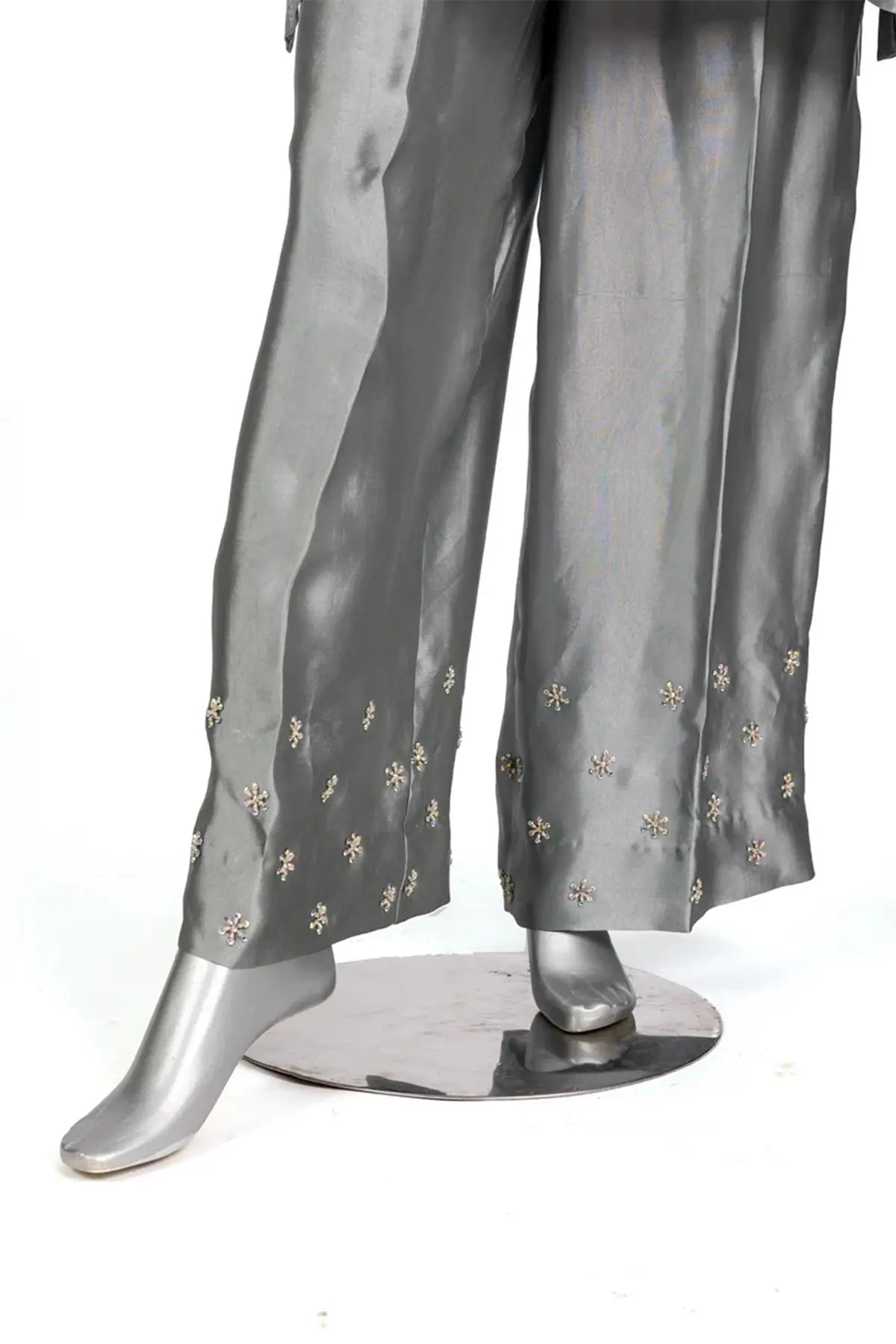 Yusra – Grey & Peach Sheesha Silk Suit by MariamRaj, available at MariamRaj.com, is a timeless piece of Pakistani formal wear. Crafted in pure Sheesha silk, the elegant grey shirt features delicate handwork embroidery with soft peach accents on the neckline, sleeves, and borders. The straight silk trouser carries subtle embroidered motifs for added finesse. Paired with an organza dupatta adorned with peach applique detailing, this stitched 3-piece ensemble blends modern grace with traditional craftsmanship. A perfect choice for weddings, Eid, festive occasions, and formal parties, designed for women who love luxury Pakistani suits online.